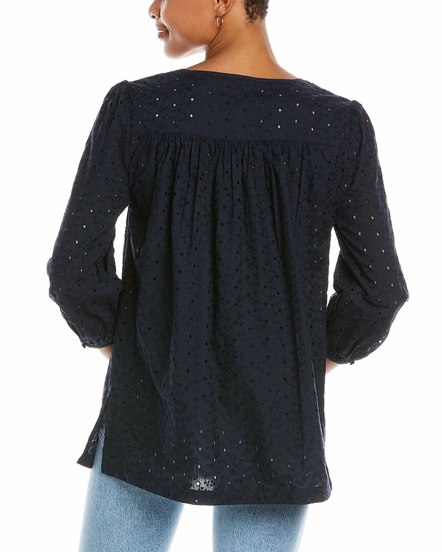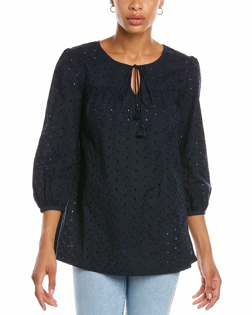 - Eyelet Blouse In Navy With Eyelet Lace Design, 3/4-Length Sleeves, Button Cuffs, And Side Slits At Seams