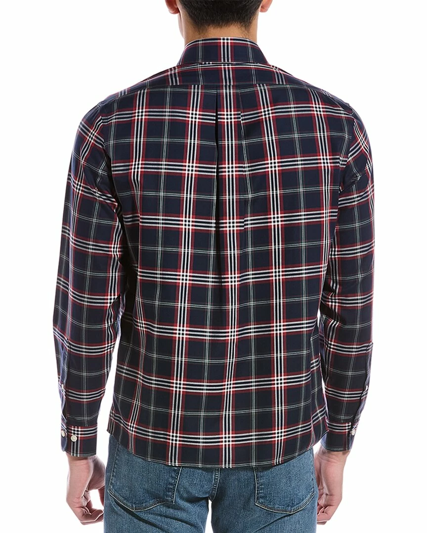 - Regent Fit Sport Shirt In Navy And Red With Button-Down Collar, Barrel Cuffs, Box Pleat At Back, And Shirttail Hem
