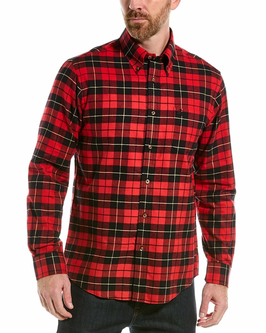 - Regent Fit Sport Shirt In Red And Black Plaid With Button-Down Collar, Left Chest Pocket, Barrel Cuffs, Shirttail Hem, And Box Pleat At Back