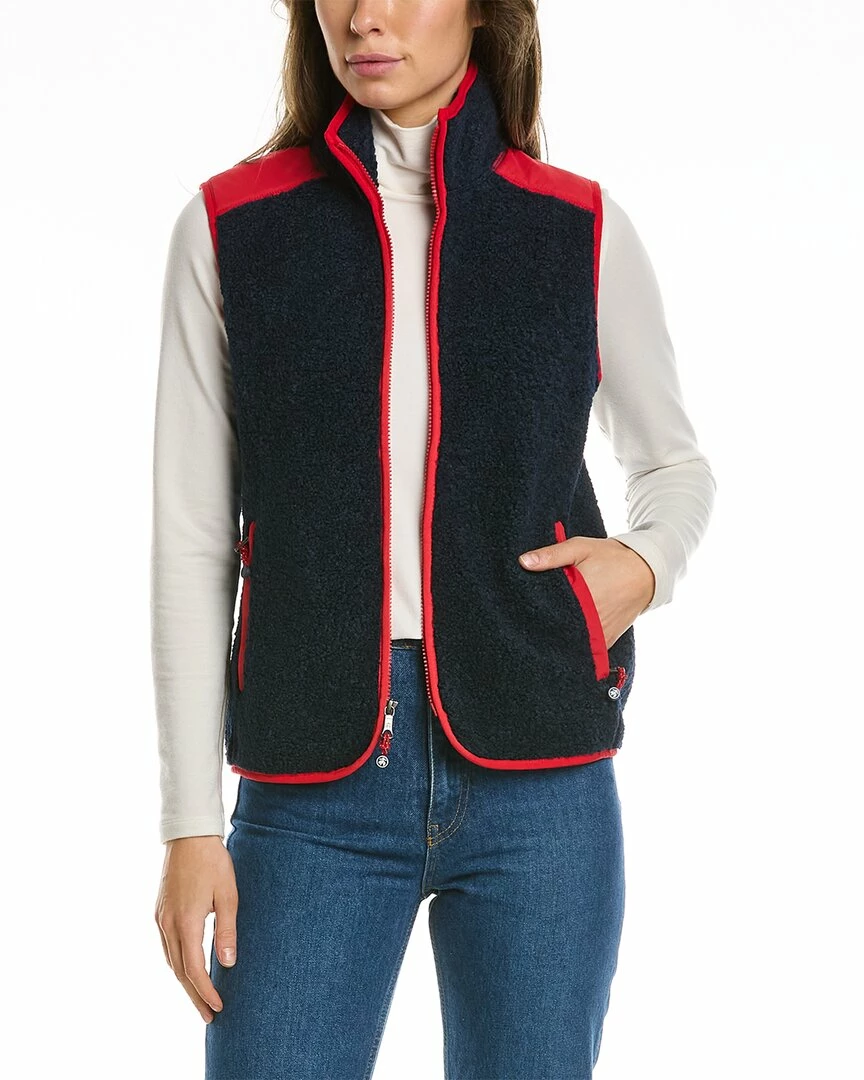 - Teddy Fleece Vest In Navy Blazer With Stand-Up Collar, Two Zippered Front Pockets, And Mesh Lining